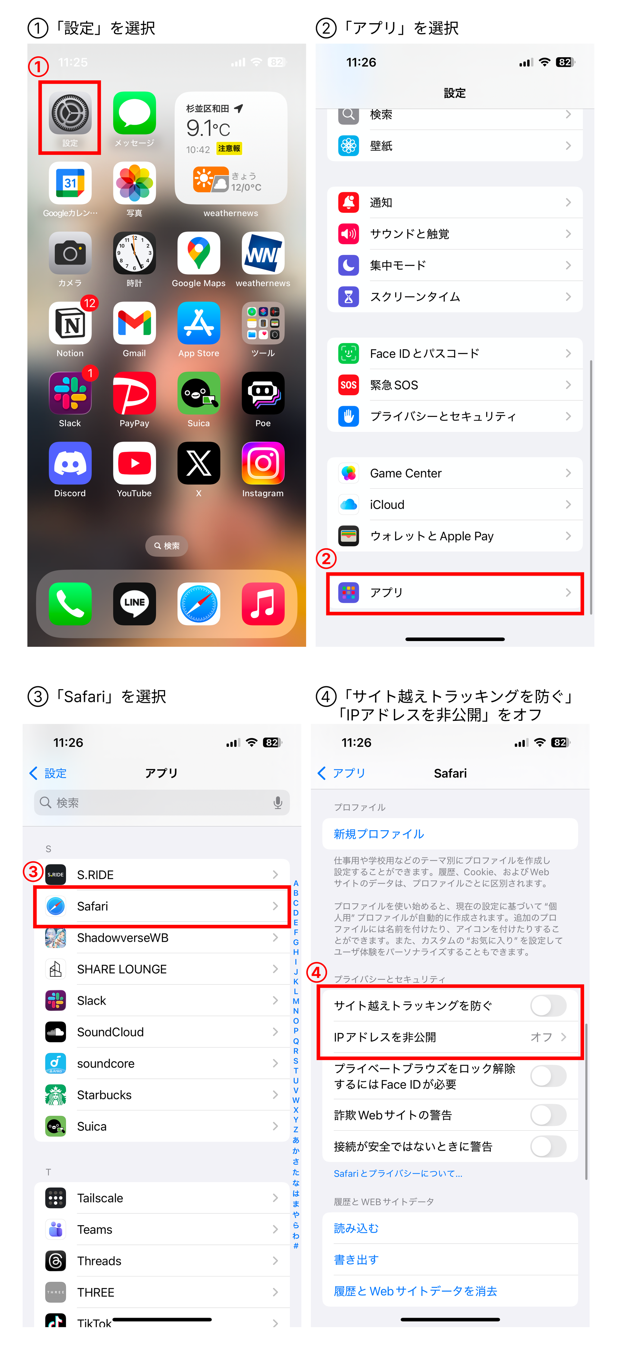 - 「設定」→「Safari」→「IPアドレスを非公開」→【オフ】に変更